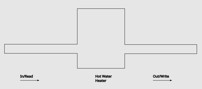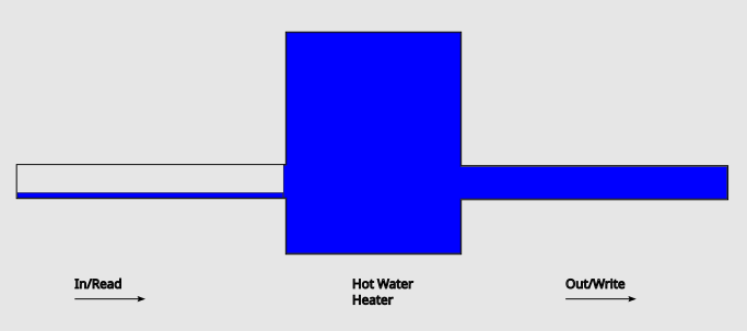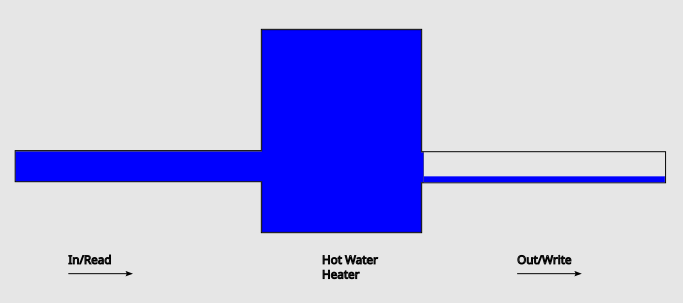Going in to this section, let’s assume that the hot water heater heats up the water to the desired temperature instantly. The point of this assumption is so that we can focus on a different factor that might be slowing down your computer. In this case, the bottleneck is going to be how fast we can bring the water to the heater and then how fast we can distribute the water after it gets heated. With this assumption in mind, we can further break down the problem into two aspects. The first aspect is that the water isn’t arriving at the heater fast enough. The second aspect is that the water can’t be distributed fast enough, which causes it to get stuck inside of the heater.