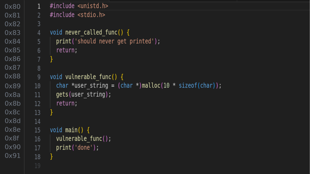 Specifically, the vulnerability is on line 10 when gets(user_string) is called. gets() is a method that takes user input from stdin and puts it in the given argument. However, it doesn’t restrict the size of the input, so even though user_string can only store 10 chars there’s nothing stopping a user from inputting 20 or even 1000. This allows a malicious user to start overwriting locations in memory after the area allocated for user_string.